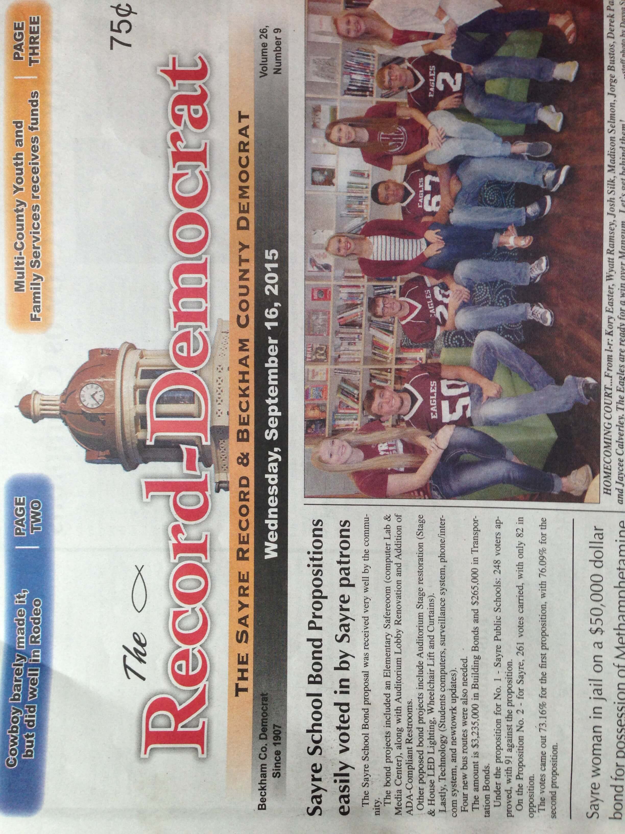 Above the fold, editor Dayva Spitzer placed three stories this past week. First, two Sayre school-bond proposals passed to secure $3.24 million in building bonds and $265,000 in transportation bonds for four new bus routes. A total of 343 people voted.