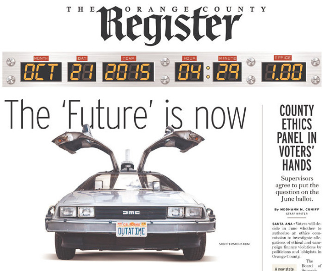 Of today’s top 10 fronts on Newseum, all featured the same topic: Back to the Future Day. As one might imagine, there were only so many ways to parody the font from the movie poster or place stills from the film, so here’s what I consider the top-three fronts for this most singular of days.