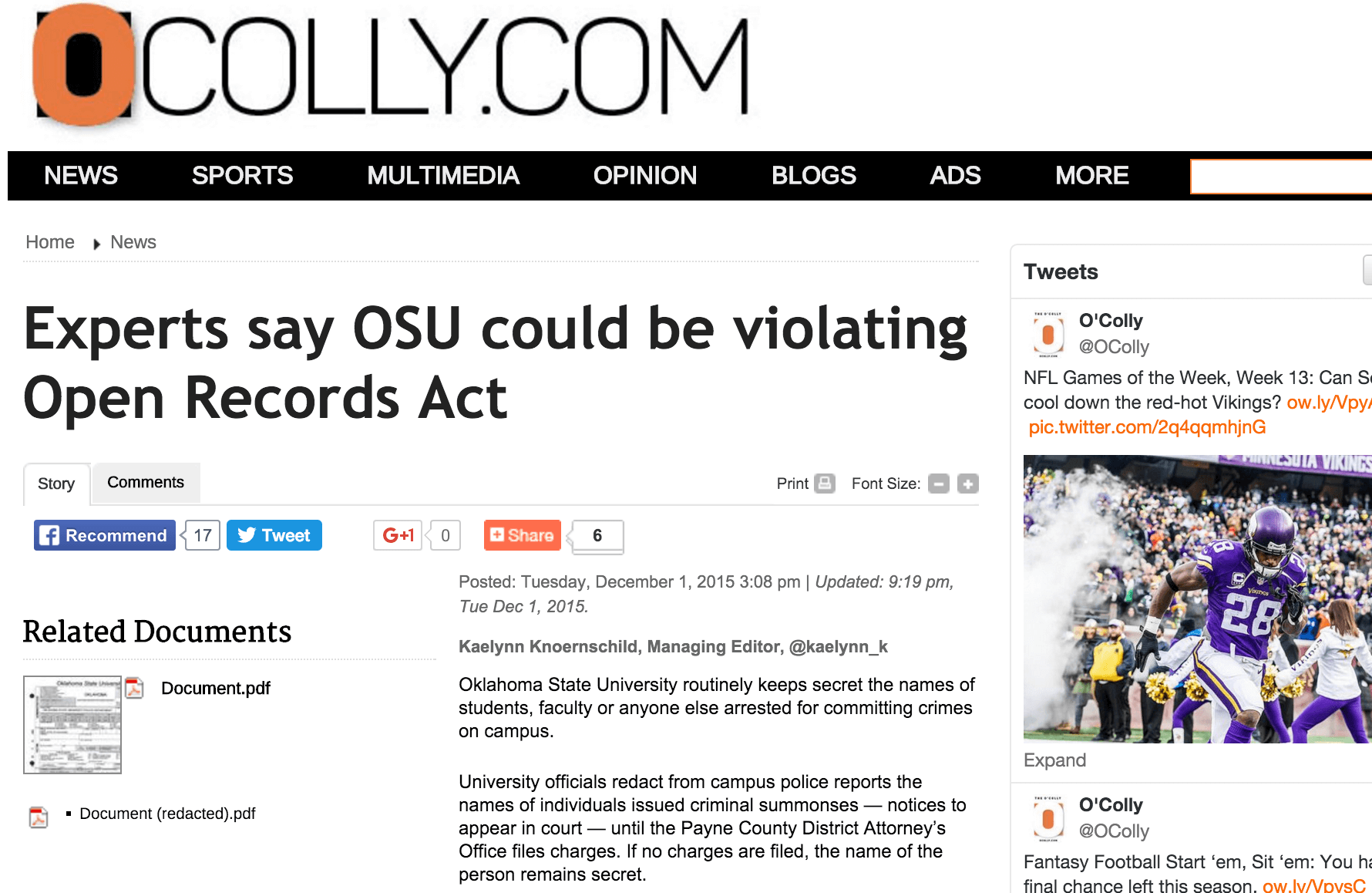 And it was news Tuesday when the O’Colly wrote about Oklahoma State University declining to release the identities of students issued summonses by campus police: