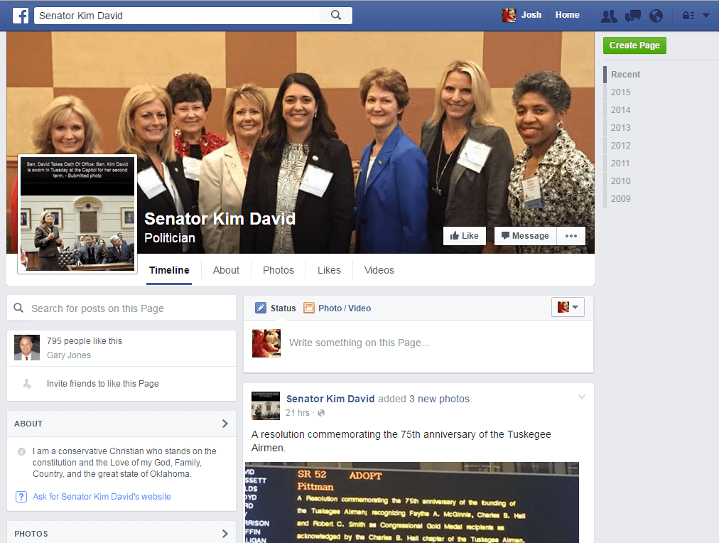 According to the data, 19 (39.6Â percent) of Oklahoma’s 48 senators keep active social media accounts on both Twitter and Facebook. The other 29 (60.4 percent) either keep an account on Facebook but not Twitter (35.4 percent), maintain inactive or private accounts (6.3 percent), or lack accounts entirely on either platform (16.7 percent).