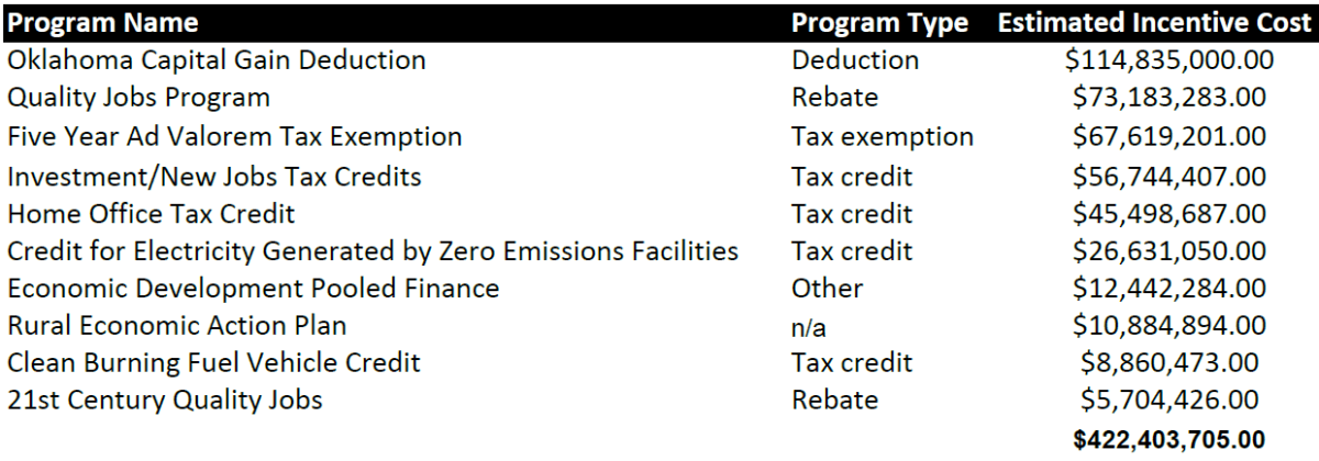 The following programs constitute the top 10 as ranked by estimated cost. (Note: In OMES’s list, there are 14 of 53 programs that exhibit “Unknown,” “None” or “N/A” values in the field for estimated incentive cost; those were excluded.)