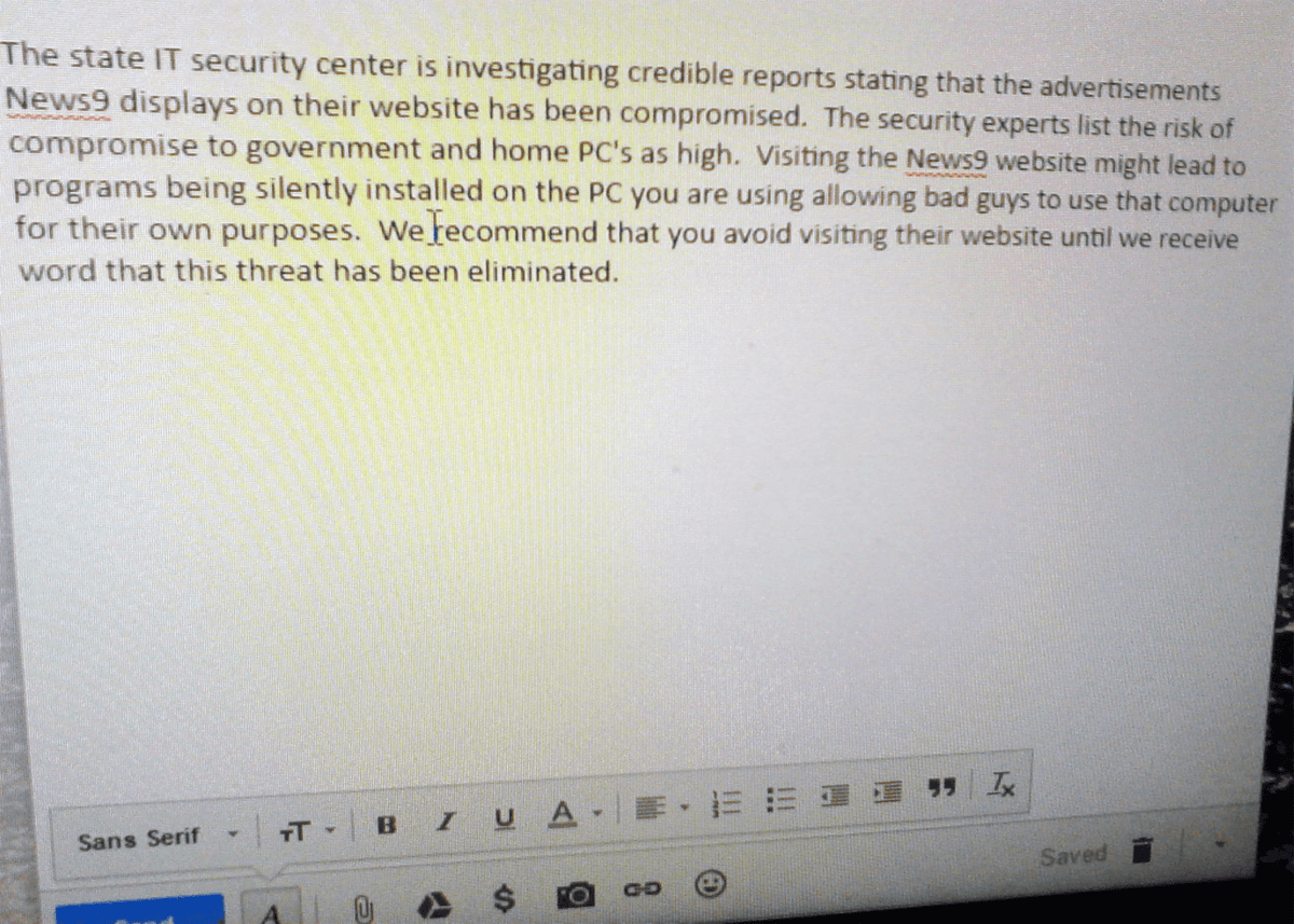 The state IT security center is investigating credible reports stating that the advertisements News9 displays on their website has [sic] been compromised. The security experts list the risk of compromise to government and home PC’s [sic] as high. Visiting the News9 website might lead to programs being silently installed on the PC you are using allowing bad guys to use that computer for their own purposes. We recommend that you avoid using their website until we receive word that this threat has been eliminated.