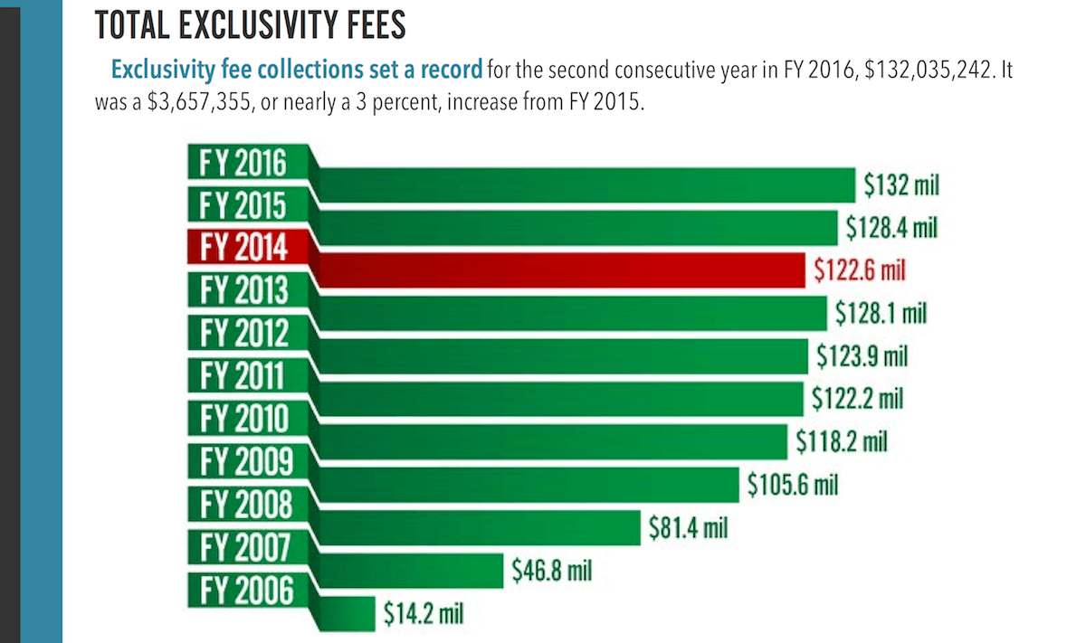 The OMES report notes that the $132 million in exclusivity fees went three places in FY16: $116 million to the Education Reform Revolving Fund (aka the 1017 Fund); $16 million to the General Revenue Fund; and $250,000 to the Oklahoma Department of Mental Health and Substance Abuse Services.