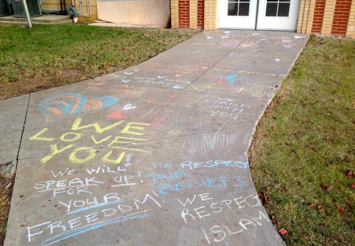 And it’s really rather simple to do: Whenever you encounter people who don’t look, speak or act like you, consider going out of your way to relate to them in a congenial manner. The friendly messages chalked outside of an OKC mosque following the election exemplify this concept.