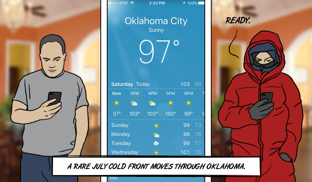 I hear a lot of people enjoy this weather, when a high of only 97 means a July cold front has come through. I think I could spend my whole life trying to understand how that can be a thing. Instead, I’ll just sit indoors and wait for fall.