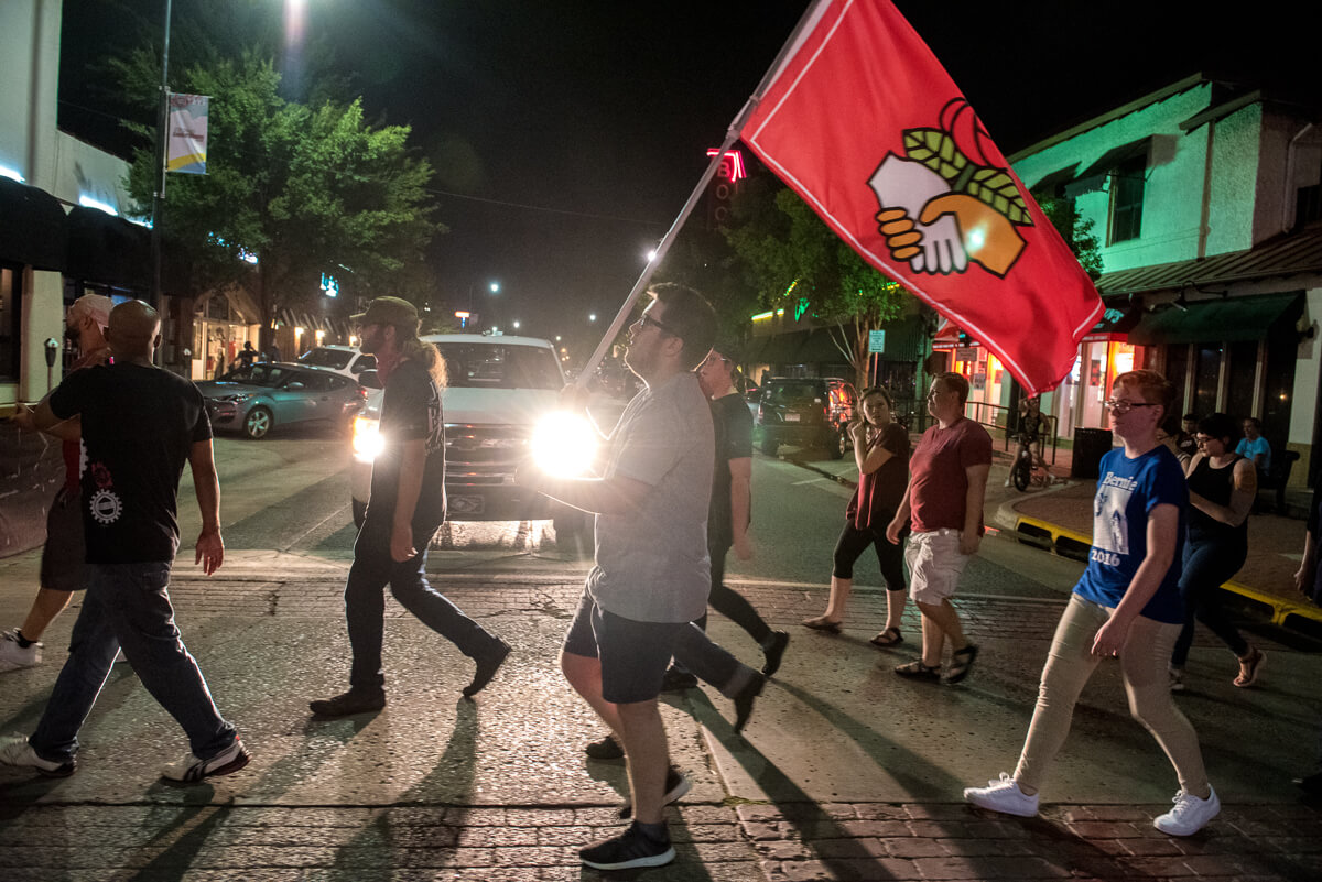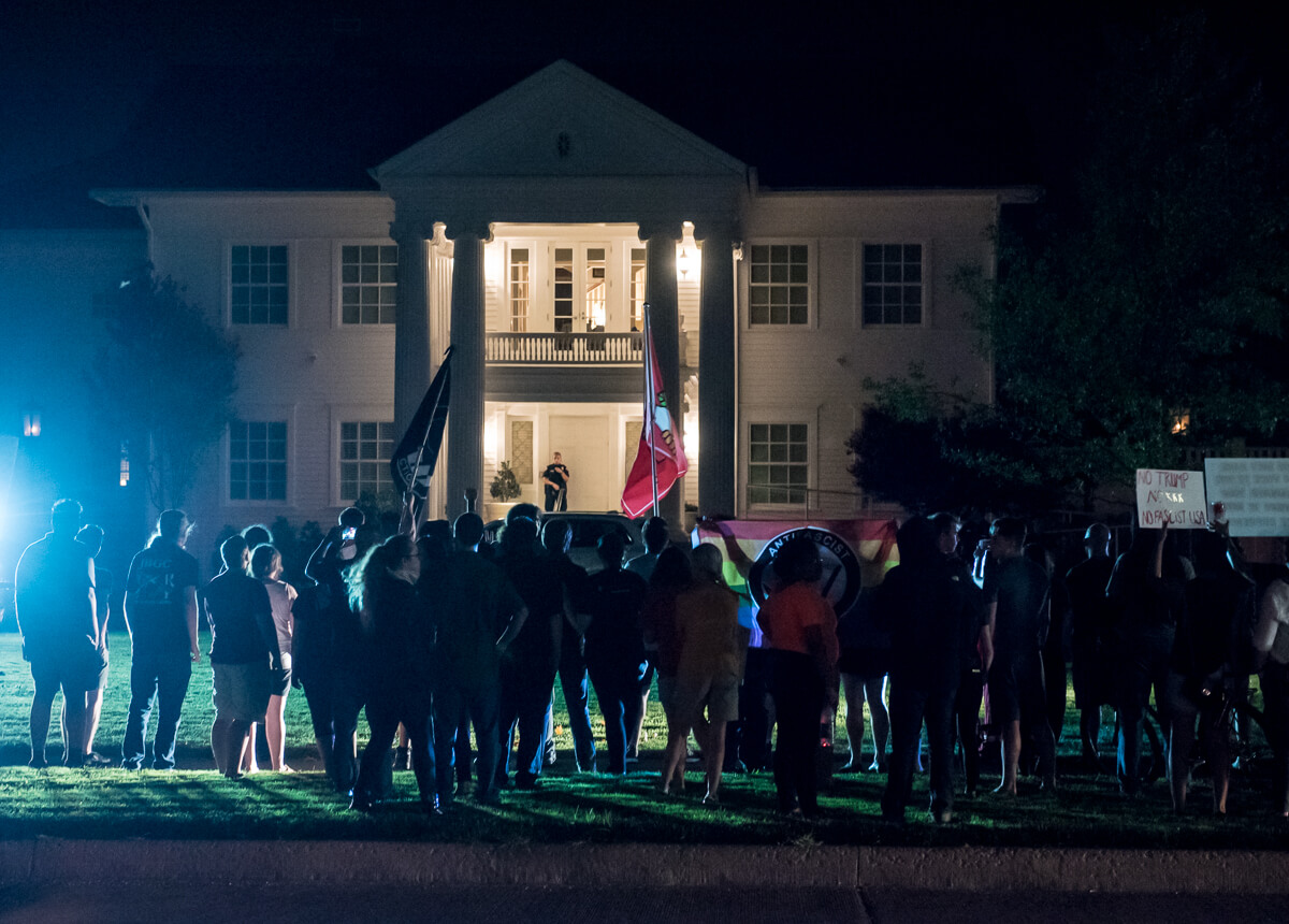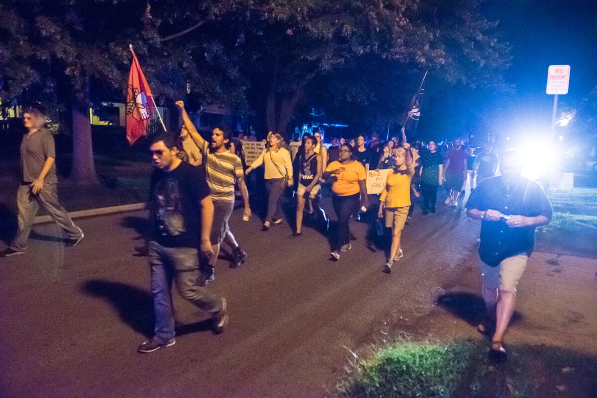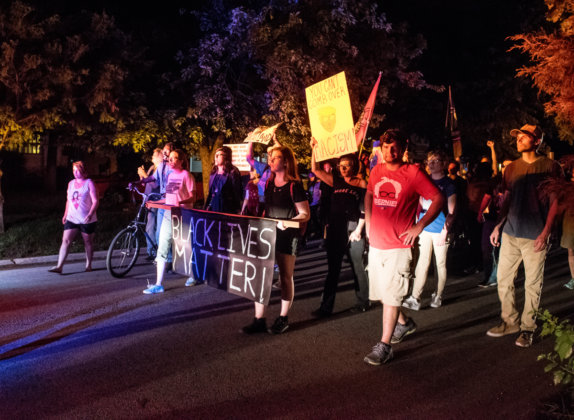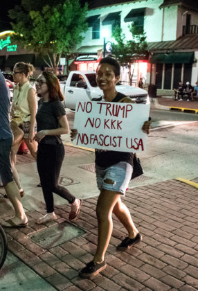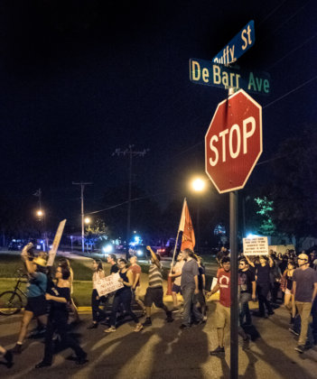 But that did not end the evening for about 50 mostly young, white adults, some carrying flags and banners and chanting, “No Trump. No KKK, no fascist USA!” as they marched through dimly lit streets to DeBarr Avenue, a long block of early 20th century homes and rental properties adjacent to Campus Corner.