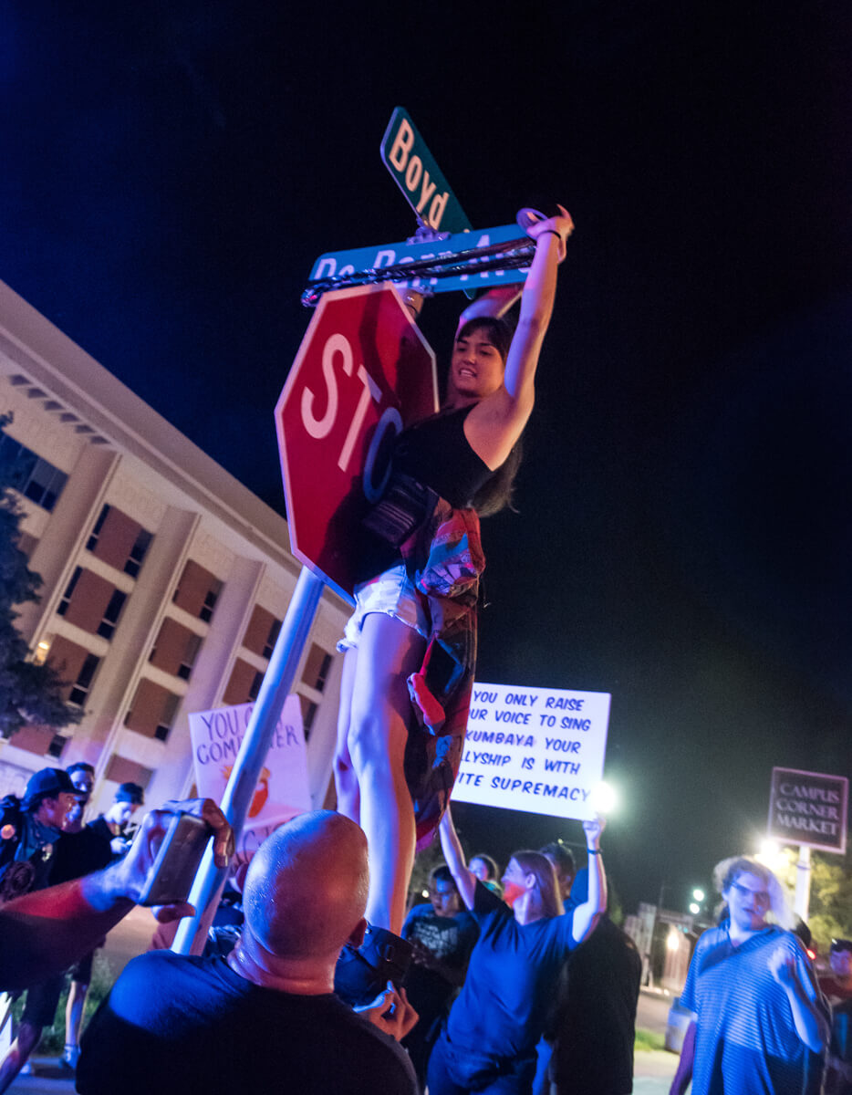 Protesters encircled the street sign at the DeBarr and Boyd intersection. One climbed the sign pole and wrapped black tape across the DeBarr Avenue name, a rejection of what the group found offensive.