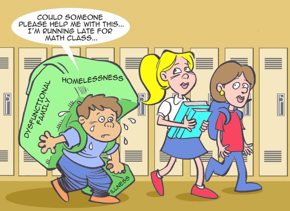 As the above cartoon indicates, students who carry an enormous burden due to homelessness, family crises or physical and mental illnesses are unlikely to master advanced math. This graphic was actually removed from Edgemere’s presentation. Veteran volunteer Kelly Pearson protested to the board, saying that she learned at the last minute that the cartoon, drawn by respected graphic artist Steve Hill, who is OKC Mayor Mick Cornett’s chief of staff, was deleted. Board member Mark Mann later said that he had seen the cartoon but did not think it was offensive.