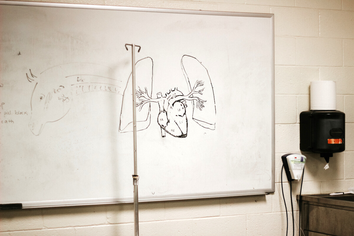 On the large animal side, a friendly cow named Daisy has a surgically-inserted port in her side. Vets are able to remove digestive fluid from her stomach painlessly to help treat calves whose stomachs aren’t working properly. In another area, stalls are padded for horses that come out of surgery, minimizing the risk of additional injury if they panic.