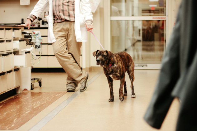 No words are spoken, but a wave of frenetic energy floods the room. A team of four people in white coats carefully lays the dog on a steel table, hunching over as their hands wave and work like magicians casting a spell. The dog lies quietly and motionless.