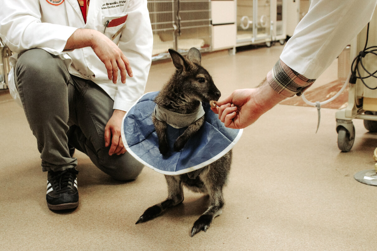 Vanessa Snyder, Sarah Schock and Ian Konsker, all DVM and interns of small animal medicine and Surgery, worked the floor at the ER that night, checking on animals who were recovering and dealing with the occasional panicked visitor. Joao Brandoa, LMV, MS, is a clinical assistant professor in zoological medicine and the resident expert for avian, exotic and zoo animal medicine. Brandoa was the wallaby’s chief doctor, and he cooed at the animal with his Portuguese accent, cradling it in his arms for visits.