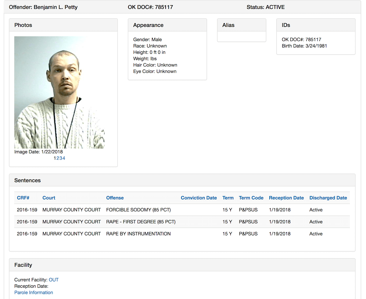 Benjamin Petty's current facility is noted as "OUT" on the Oklahoma Department of Corrections offender lookup system. The only "appearance" detail listed is that Petty is male. (Screenshot)