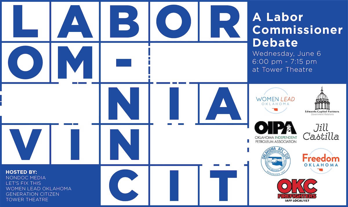 In one week, NonDoc, Let’s Fix This, Women Lead Oklahoma and Generation Citizen will co-host the Labor Omnia Vincit GOP primary labor commissioner debate at the Tower Theatre in Oklahoma City.