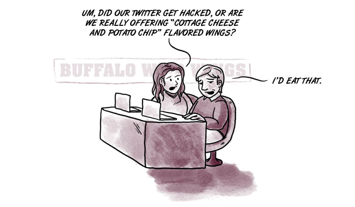 The Buffalo Wild Wings page was hacked, for sure, but I feel like the perpetrator didn’t take full advantage of the situation. They certainly missed the opportunity to announce a flavor of wings — any flavor — and I feel like it could have had a small chance of coming true eventually.