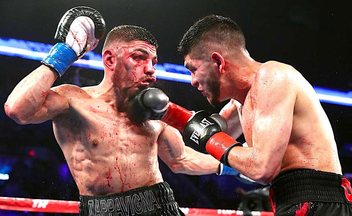 With blood pouring down both men’s faces, the violence continued into the sixth round as both men took turns battering each other. Every time Saucedo seemed about to finish his foe, Zappavigna would claw his way back into the bout with a wave of aggression. Things were beginning to turn in Saucedo’s favor as Zappavigna suffered swelling and bad cuts on both his eyes. The ringside doctor took a long look in between rounds to determine if he would be able to continue.