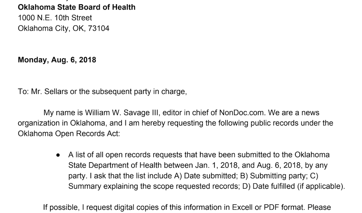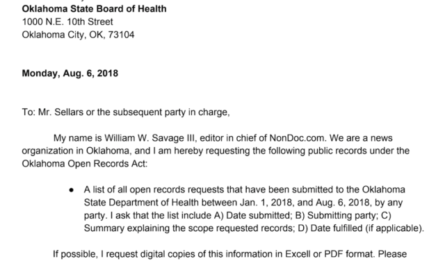 We hope legislators from both parties will begin their week by inquiring about the Oklahoma State Department of Health’s open records request statistics.