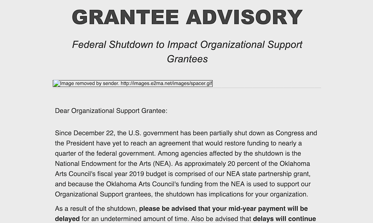 This morning, 38 arts entities across Oklahoma received notification that more than $595,000 in mid-year “organizational support” reimbursements “will be delayed for an undetermined amount of time” owing to the ongoing federal government shutdown.