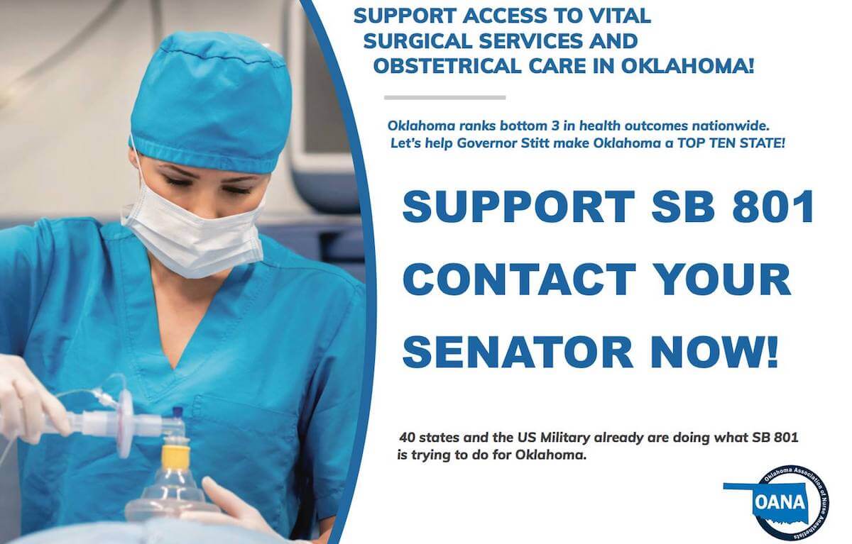 Oklahoma currently ranks 47th in health care outcomes and has consistently been placed in the bottom quartile. SB 801 and its twin bill HB 1027 seek to modernize Oklahoma’s outdated laws to better define the relationship between a doctor and his or her anesthesia provider, which is often a Certified Registered Nurse Anesthetist or CRNA.
