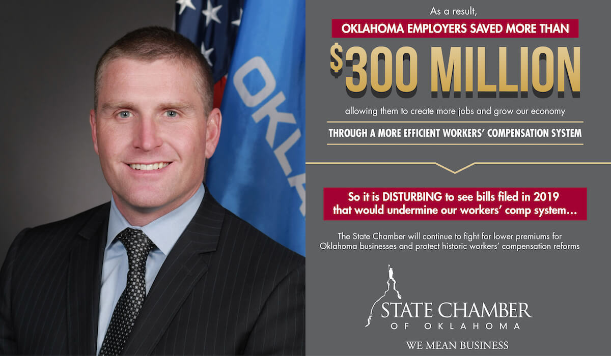 “So it is DISTURBING to see bills filed in 2019 that would undermine our workers’ comp system,” the flier (embedded below) states. “The State Chamber will continue to fight for lower premiums for Oklahoma businesses and protect historic workers’ compensation reforms.”