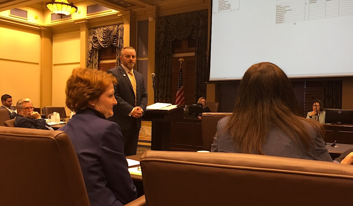 Senate Minority Leader Kay Floyd (D-OKC) attended Wednesday’s meeting on the bills while she waited to present her own measure (SJR 20) that would propose modification of the Oklahoma Constitution’s rules about educators holding office.