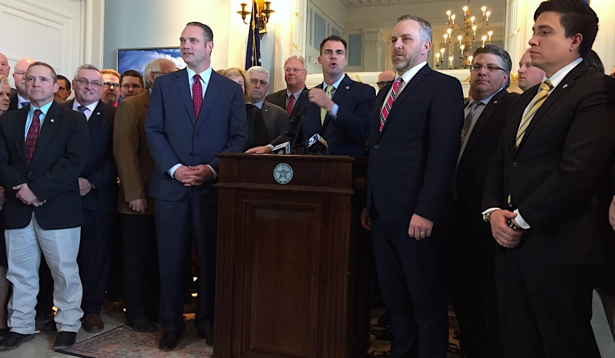 Flanked by more than 70 GOP legislators, Gov. Kevin Stitt joined House Speaker Charles McCall (R-Atoka) and Senate President Pro Tempore Greg Treat (R-OKC) at a 4 p.m. press conference today to announce the agreement.