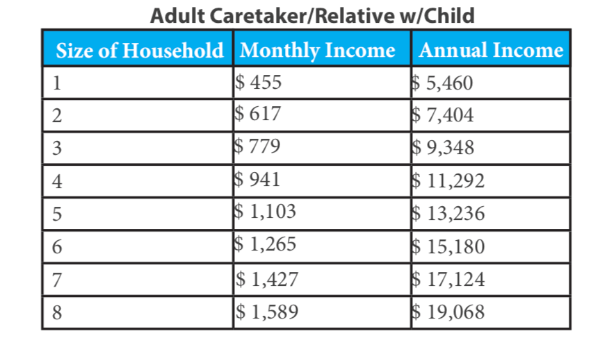 For an adult caretaker (that would be me), the maximum amount a household of two people can earn is $617 a month. A chart that outlines the eligibility and income guidelines can be found here.