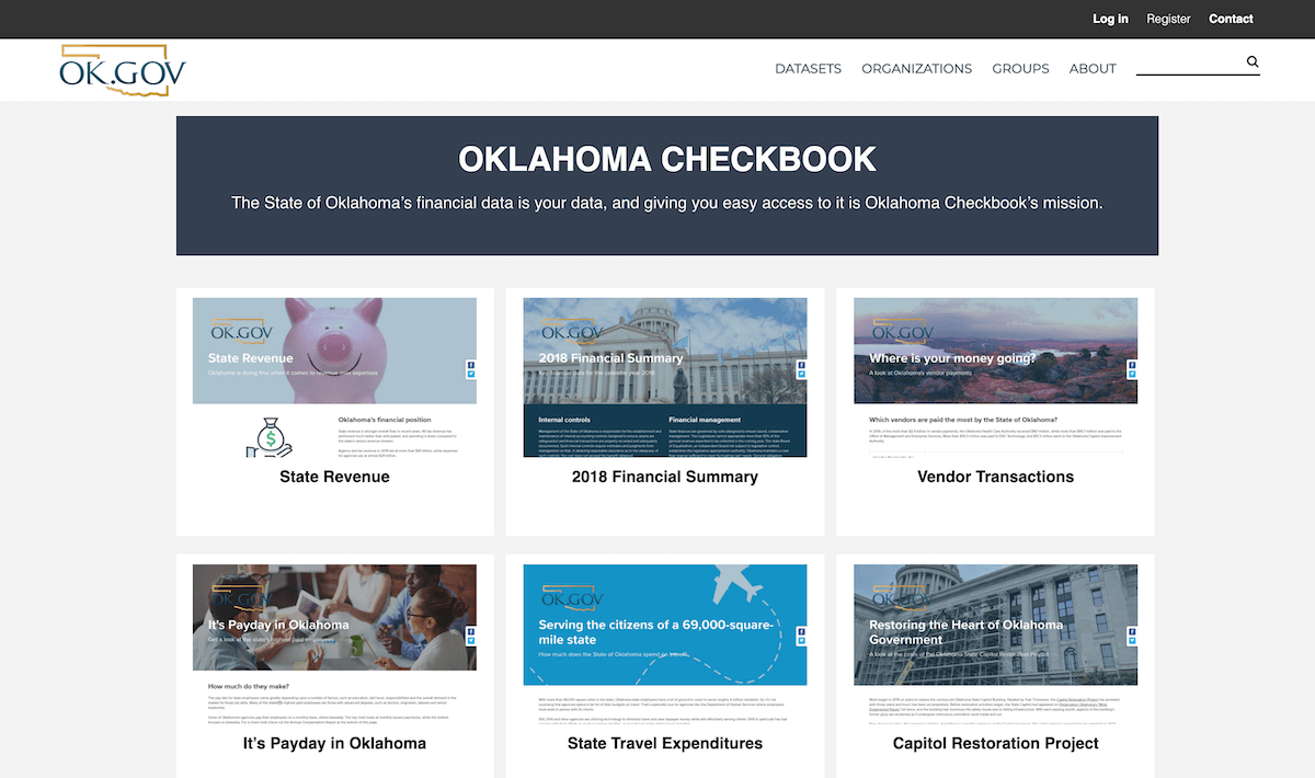 Accessible at checkbook.ok.gov, the Oklahoma Checkbook features 12 primary topic areas on its homepage, including: state revenue, 2018 financial summary, state travel expenditures and an Oklahoma real property asset report. The site features filter options and other interactive opportunities for users. Filtered data sets can be shared by simply copying and pasting the URL.