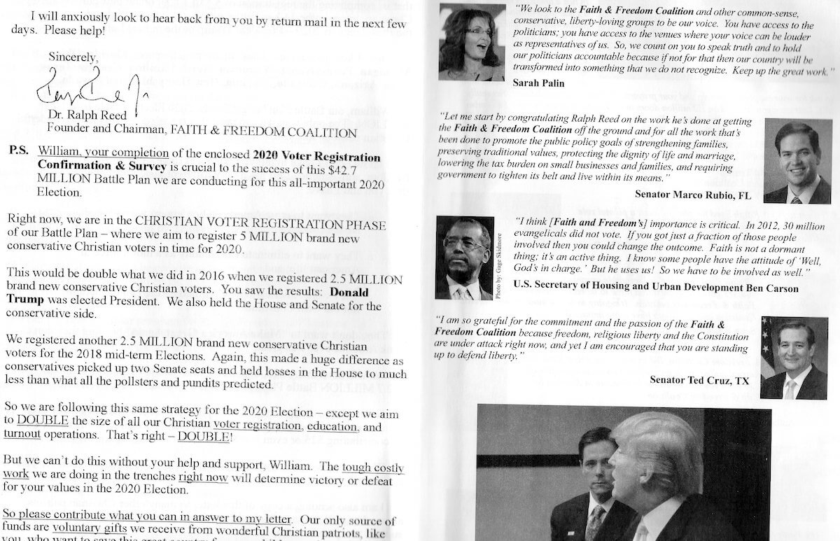 Now comes a seven-page pamphlet from some character named Ralph Reed, founder and chairman of the Faith and Freedom Coalition, which claims to have over 2 million “members and supporters” who are “mobilizing conservative Christians for effective political and civic action.”