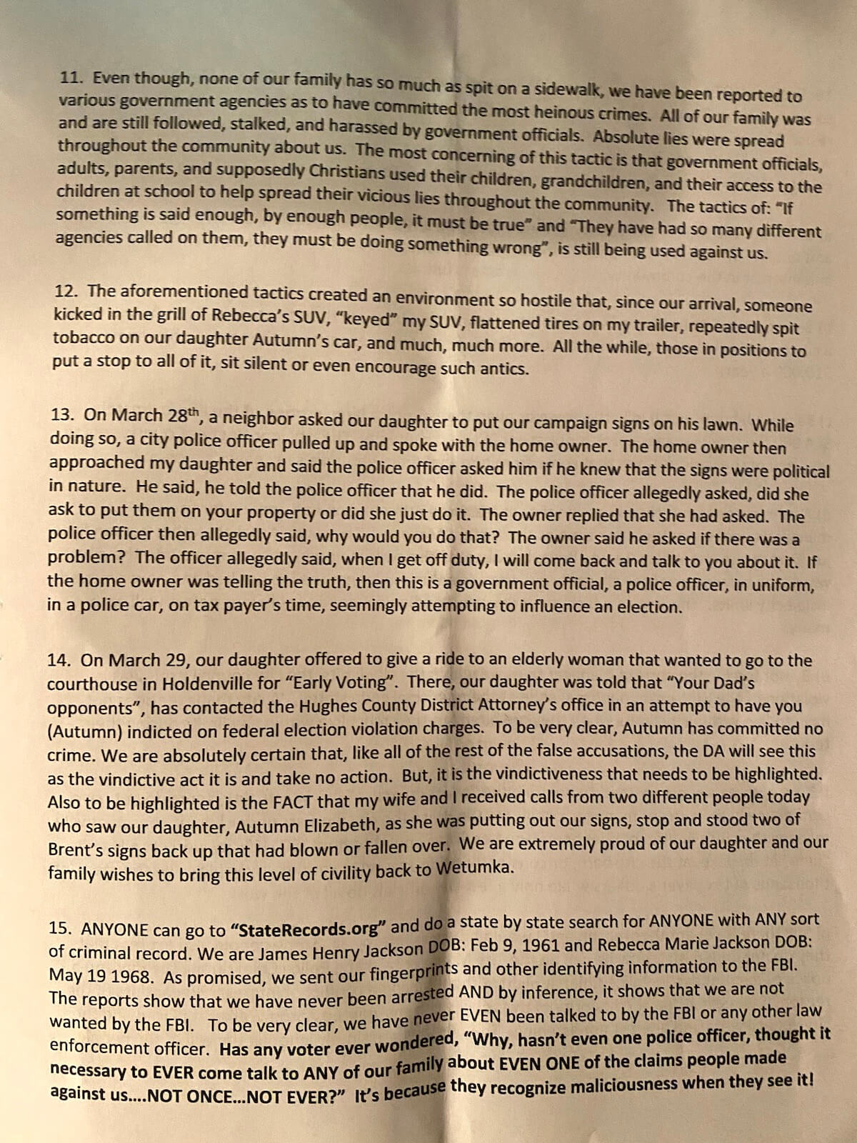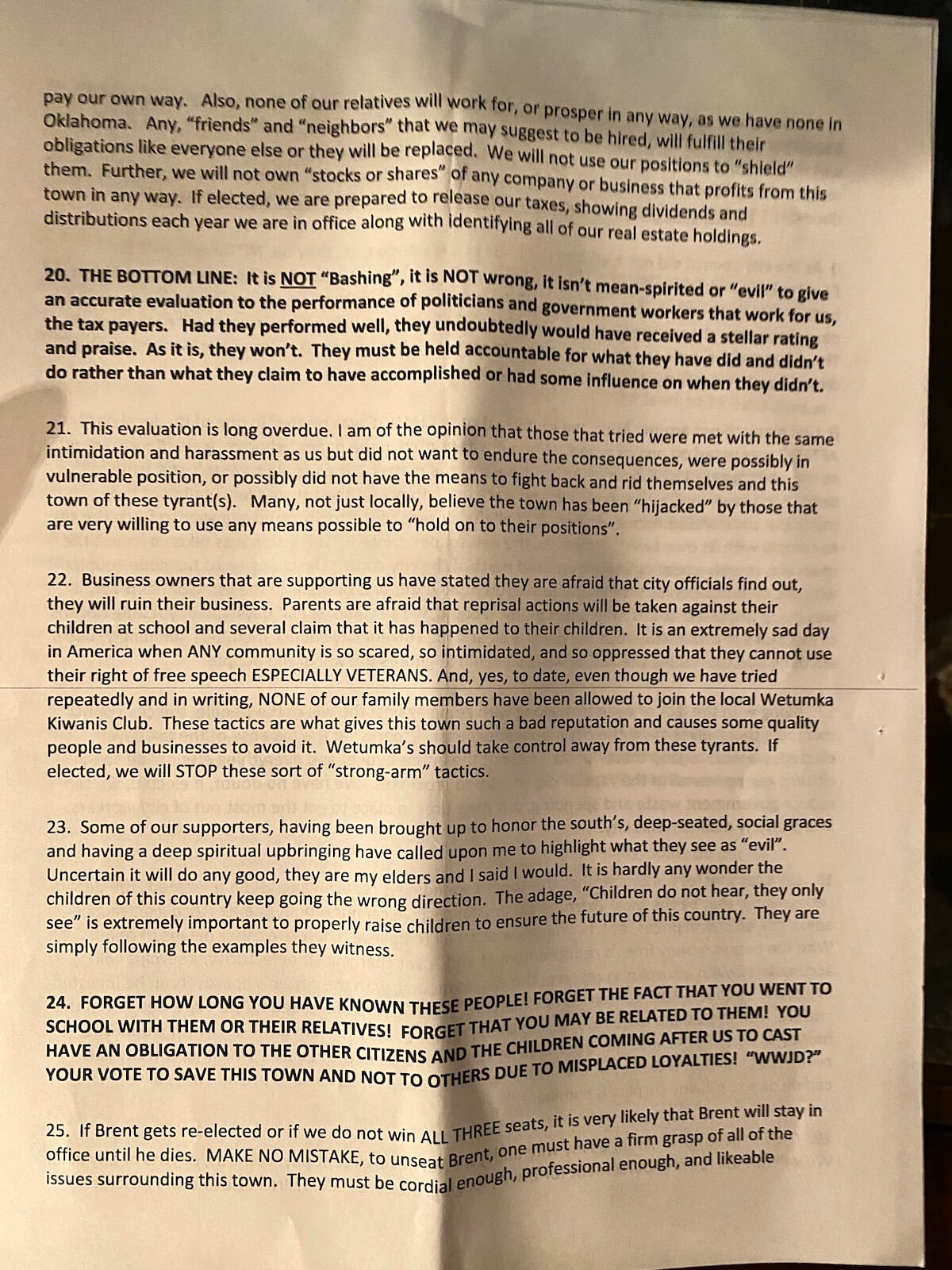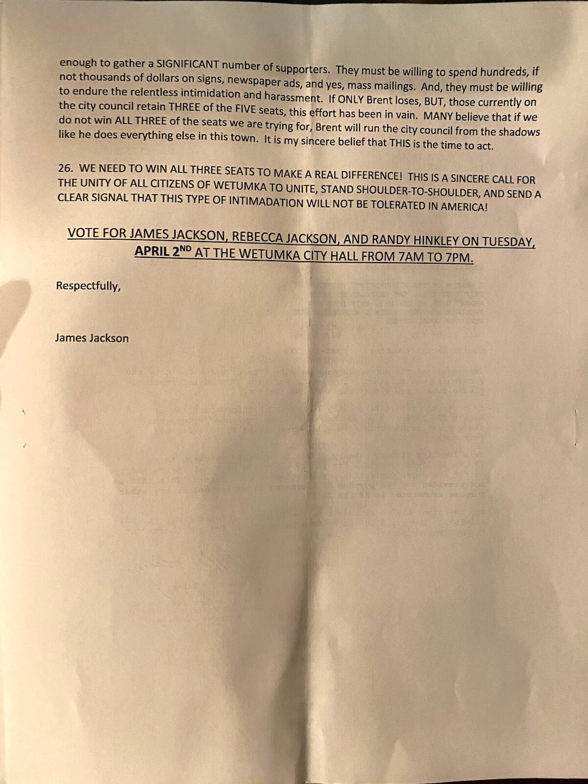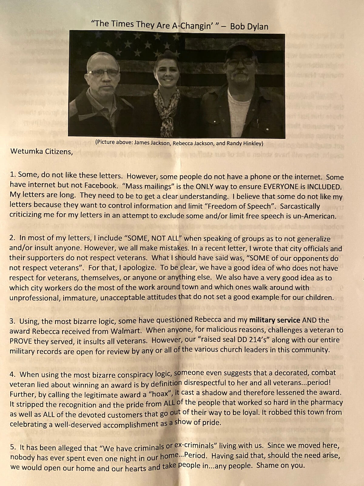 Leading up to the April election, Hinkley had appeared in photographs with Jackson on a series of letters Jackson mailed to all Wetumka residents. One of those letters appears below.