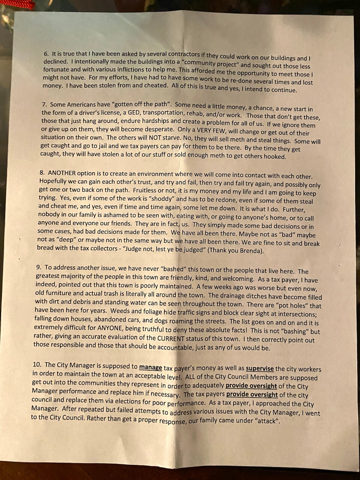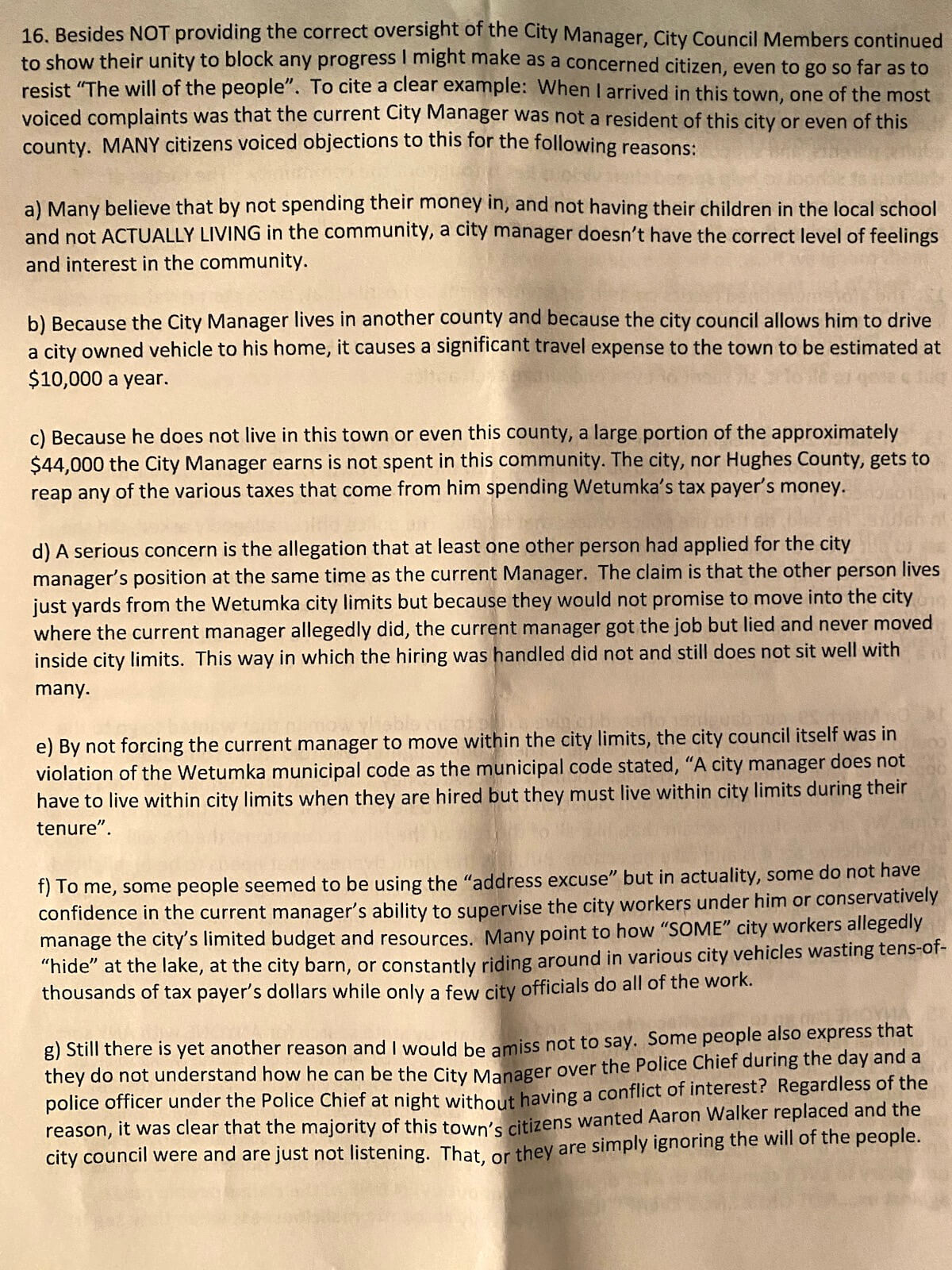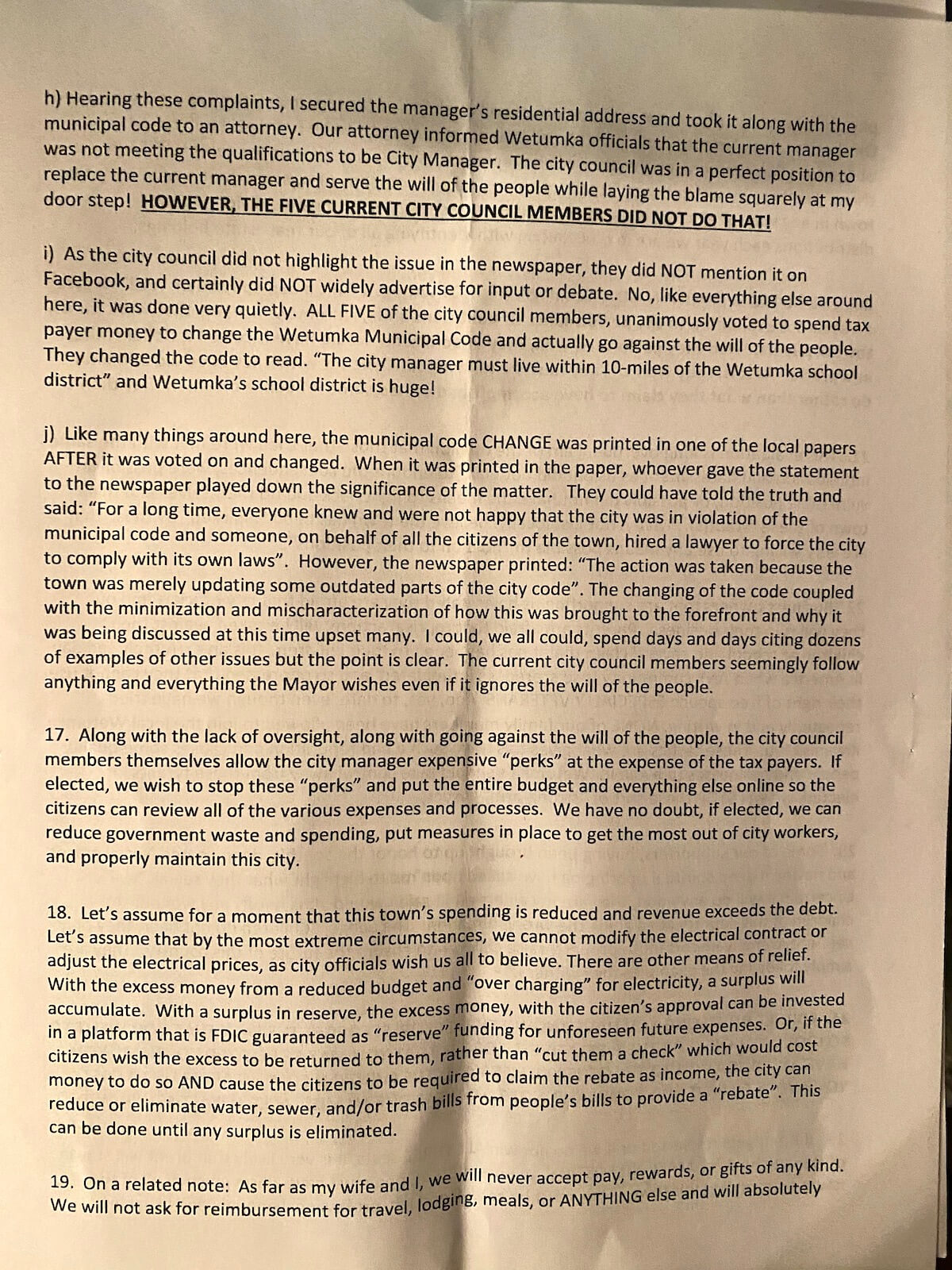 He said if he walked around town during the day, it would be plain to see that the actual residents of Wetumka support his efforts to address municipal water problems and high electricity rates.