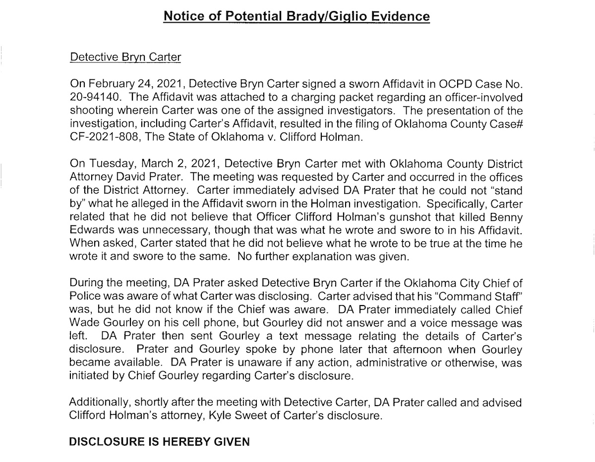 Shared with a handful of criminal defense attorneys in late May, a notice of potential exculpatory evidence revealed that Oklahoma City Police Department detective Bryn Carter admitted March 2 to Oklahoma County District Attorney David Prater that he had perjured himself one week earlier in signing a criminal affidavit.
