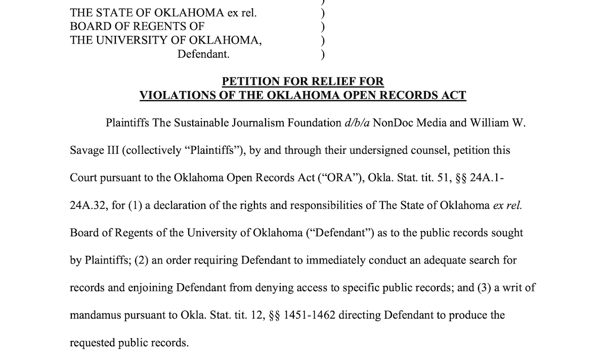 As a result, NonDoc filed a lawsuit Thursday in Cleveland County District Court asking a judge to order OU to release the Jones Day reports owing to overwhelming and compelling public interest in what occurred at the state’s flagship public university.