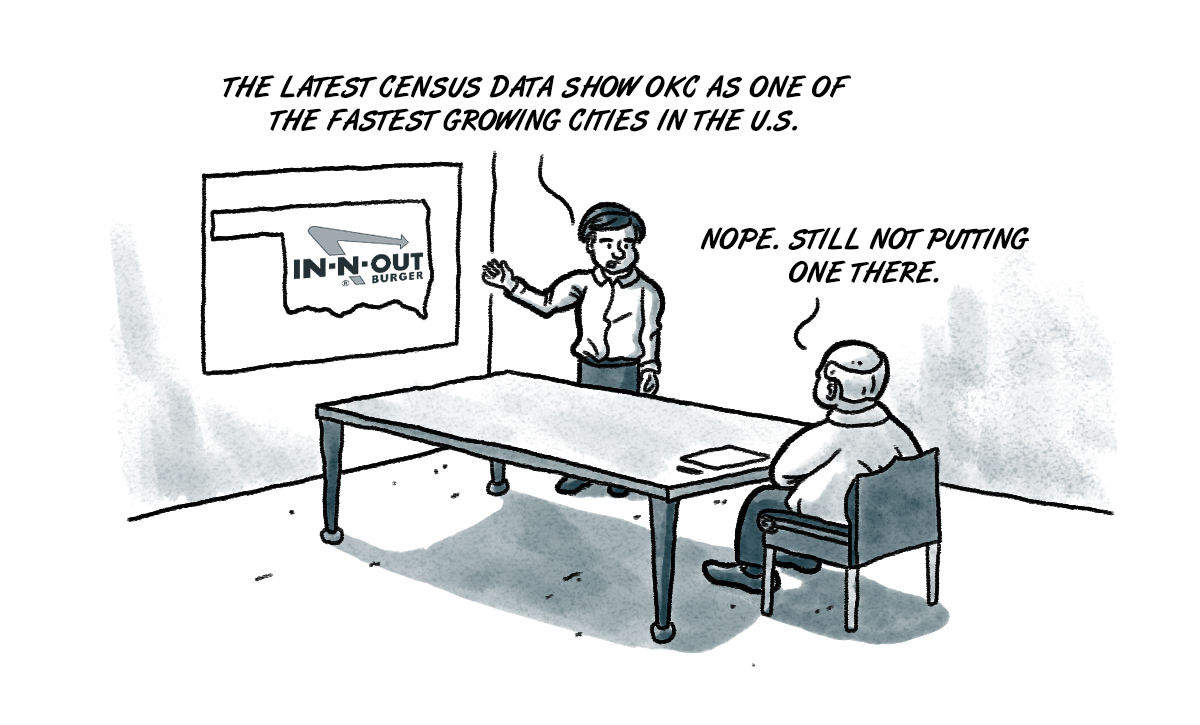 What will it take? If the news of Oklahoma City’s larger-than-expected population gain on the latest U.S. census can’t bring an In-N-Out Burger franchise here, what do we need to do? OKC is already a haven for just about every other fast food restaurant, and now it appears we have many more mouths (read: customers) than market analysts previously thought.