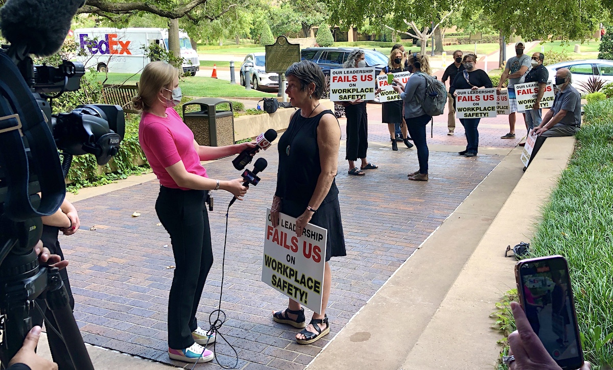 “I’m here because, since school began, I have been serving as a part-time counselor for my students on all issues COVID-related,” said European history professor Jennifer Davis. “That’s because the university is failing to provide clear leadership, clear policies about congregate living, classroom spaces, about public spaces and how we should behave in those spaces. That’s really what I want.”