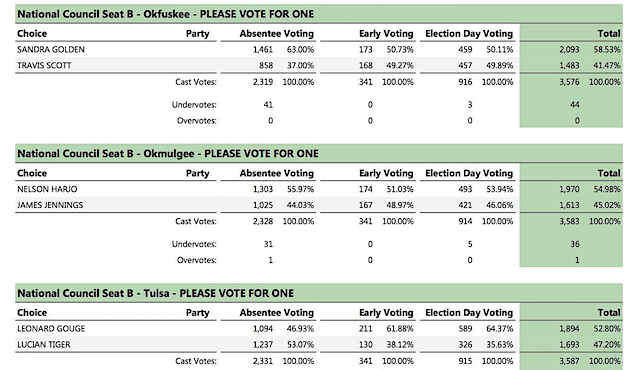 In the Okfuskee District, former councilmember Sandra Golden earned 2,093 votes (58.5 percent), while incumbent Rep. Travis Scott — who sought his fourth term on the Council — finished with 1,483 votes. Golden previously served on the National Council from the Okfuskee District. She was elected in 2001 and served until 2005.