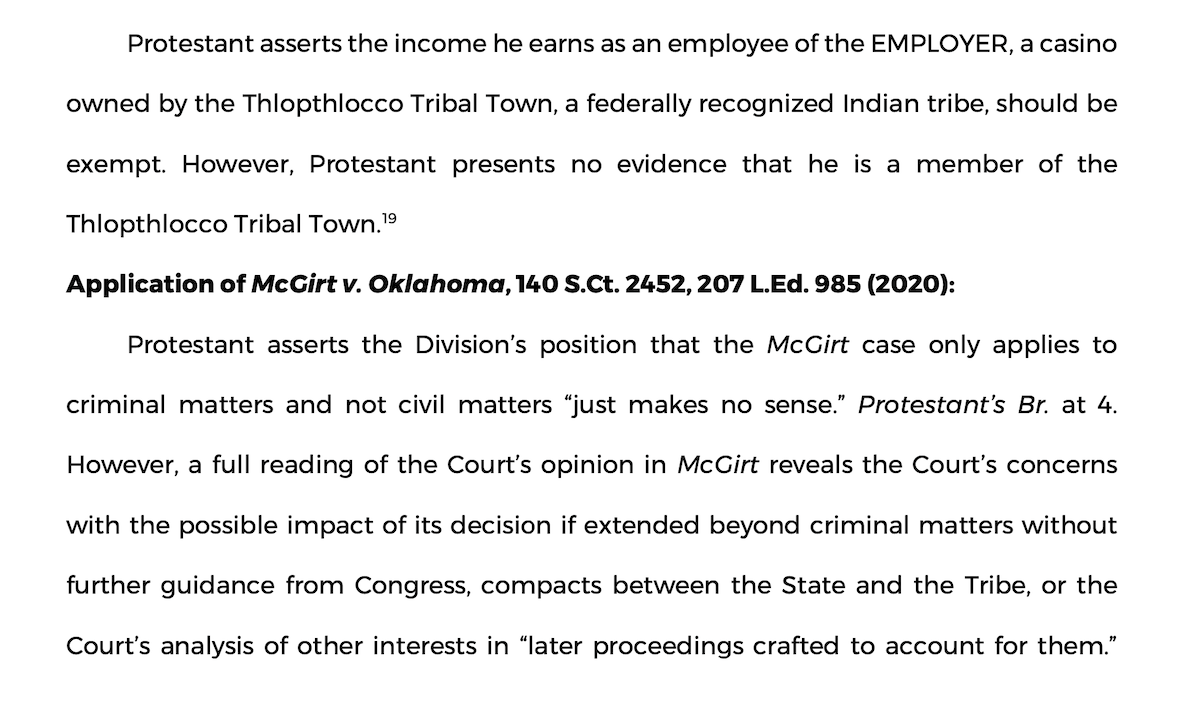 In the Tax Commission’s order, about three pages are dedicated to the “application” of the McGirt v. Oklahoma decision, which the OTC’s Income Tax Accounts Division has stated does not to affect civil matters such as taxation jurisdiction.