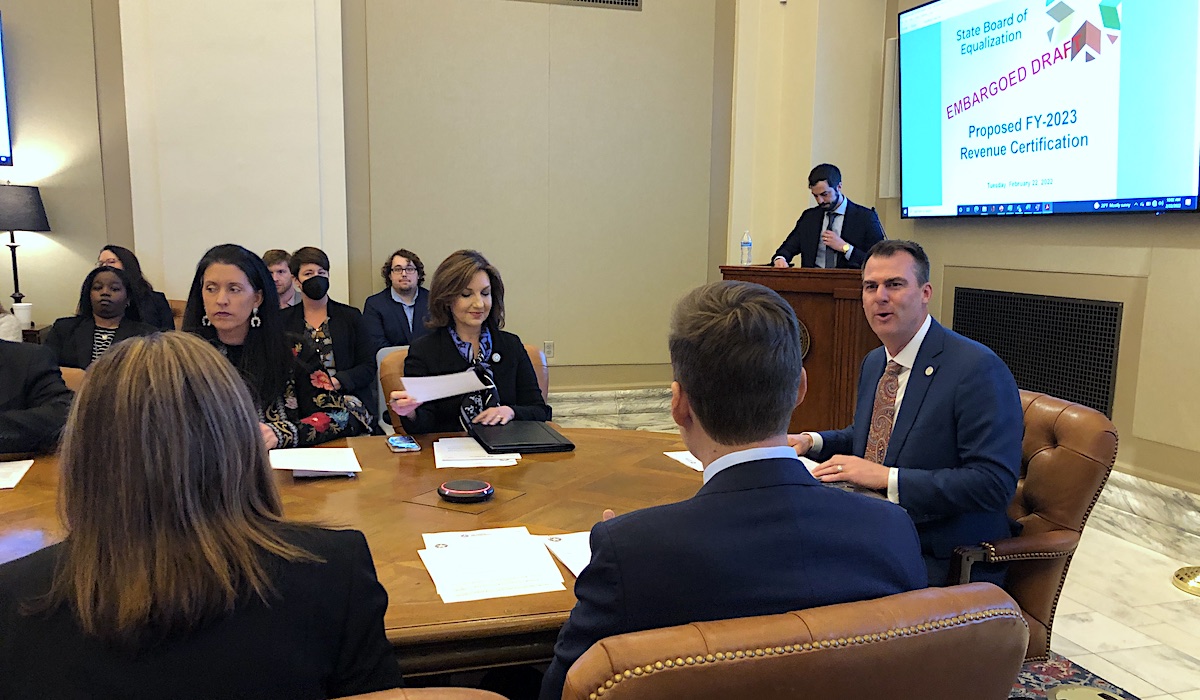 During today’s meeting of the State Board of Equalization, Gov. Kevin Stitt smiled when a budget analyst noted that Oklahoma is estimated to start next fiscal year with $2.5 billion in savings, or a 47.1 percent reserve, which ranks fourth in the country among all states. Stitt turned over his left shoulder and winked at Senate Appropriations and Budget Chairman Roger Thompson.
