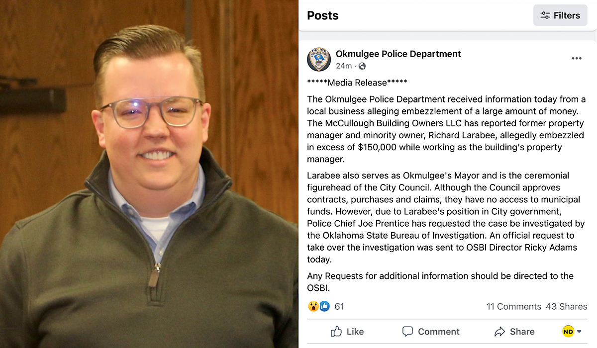 “The Okmulgee Police Department received information today from a local business alleging embezzlement of a large amount of money. The [McCulloch] Building Owners LLC has reported former property manager and minority owner, Richard Larabee, allegedly embezzled in excess of $150,000 while working as the building’s property manager,” the press release stated. “Larabee also serves as Okmulgee’s Mayor and is the ceremonial figurehead of the City Council. Although the Council approves contracts, purchases and claims, they have no access to municipal funds.”
