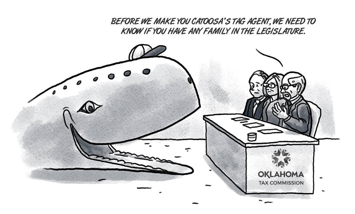 But if the Oklahoma Tax Commission is looking for someone to replace Teresa O’Donnell as tag agent in Catoosa, maybe the town’s most famous resident should apply. What’s the worst that could happen? And if the famous Blue Whale of Catoosa doesn’t do a good enough job, it could send the Tax Commission a retirement letter, contingent upon the state agency appointing the Tulsa Driller as its successor, of course.