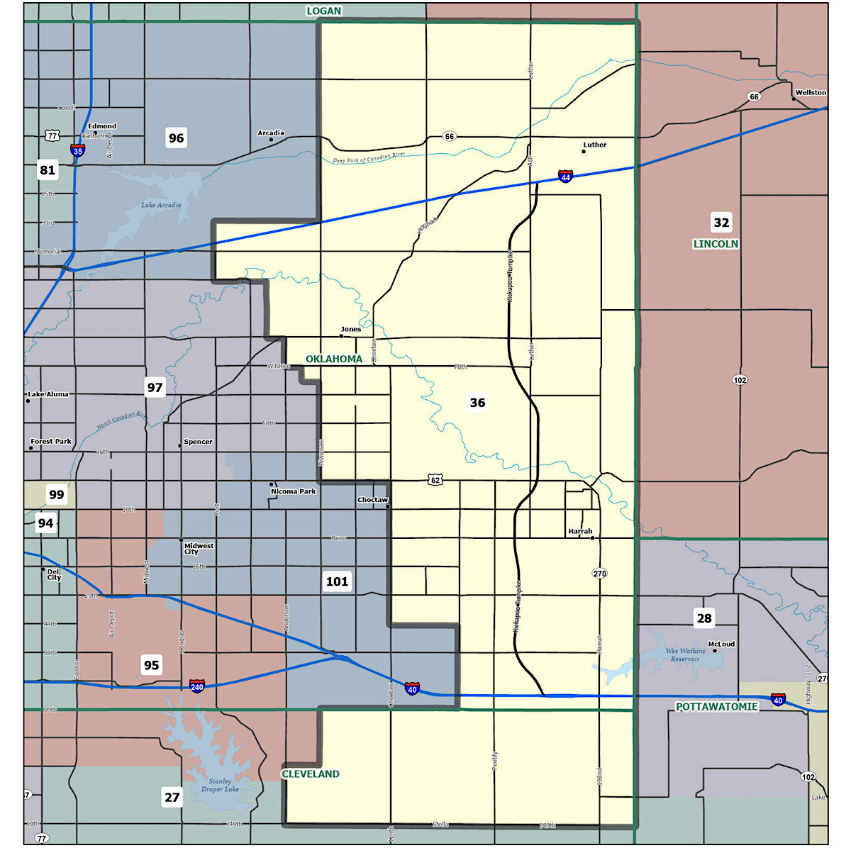 House District 36 — which was previously located in Osage County, near the Kansas border — now encompasses a large portion of eastern Oklahoma County and provides new representation for the cities of Luther, Harrah, Choctaw and Jones, as well as a smaller portion of northeastern Cleveland County.