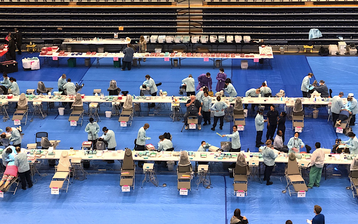 This care is provided by volunteer professionals on a first-come, first-served basis and without requirements regarding income, insurance or immigration status. Everyone is eligible. Dental services include cleanings, fillings, extractions and x-rays. Vision services include eye exams, glaucoma testing and prescription eyeglasses made on site.