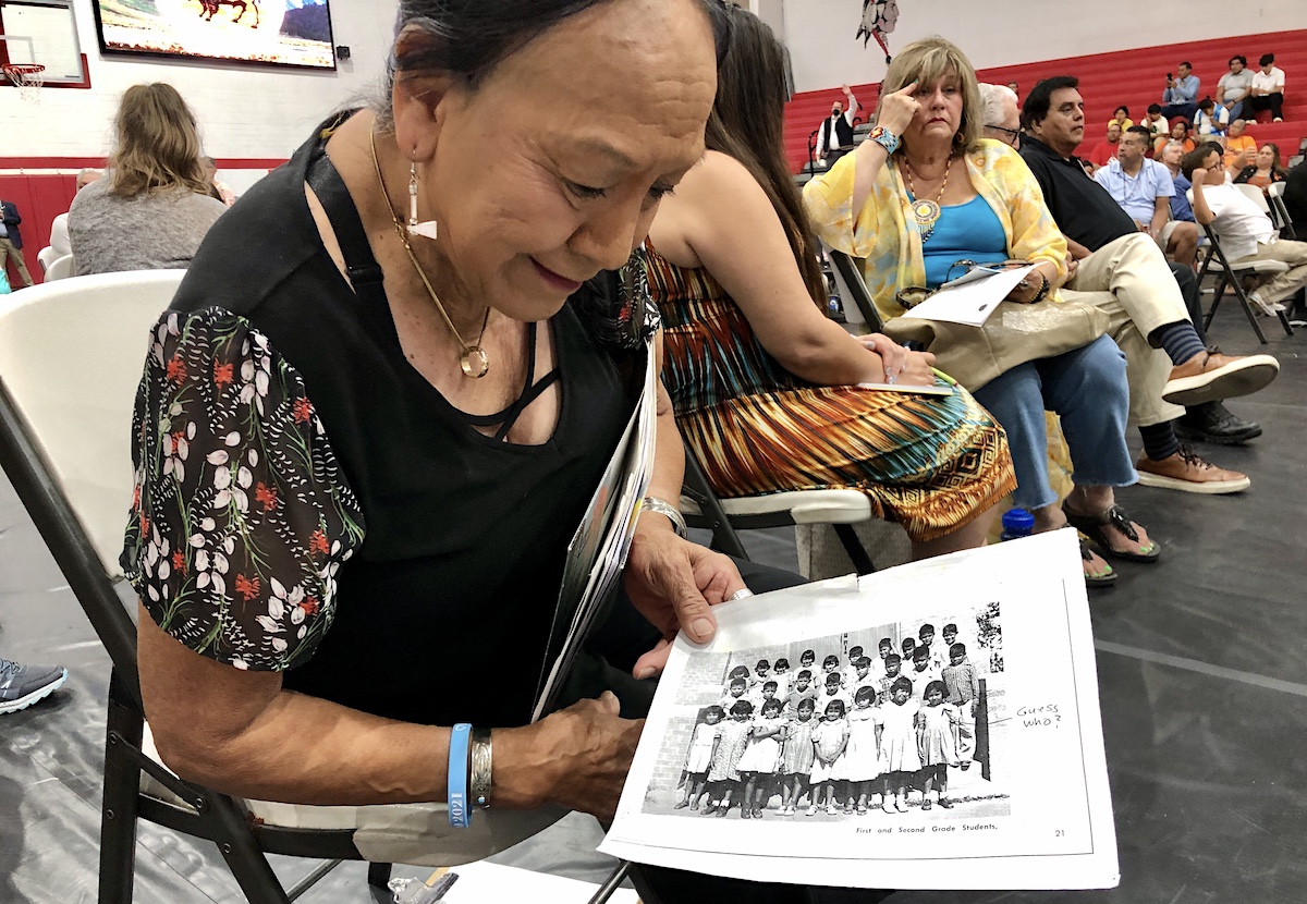 “In spite of the difficulties, I managed to survive and became an honor student, even though I was teased by the other children,” Twohatchet said, fighting back tears as she spoke. “I think the most traumatic (thing) about me is they cut off my hair, so that is why I wear my hair long.”