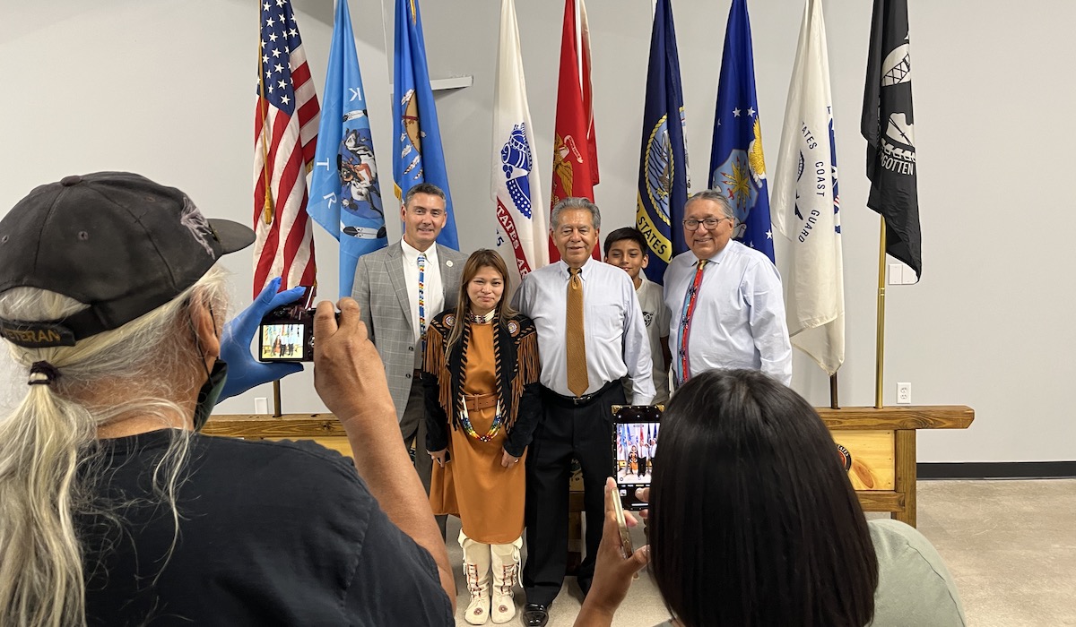 As she stood next to Spottebird, Whitehorse DeLaune spoke of her Kiowa heritage and upbringing.
