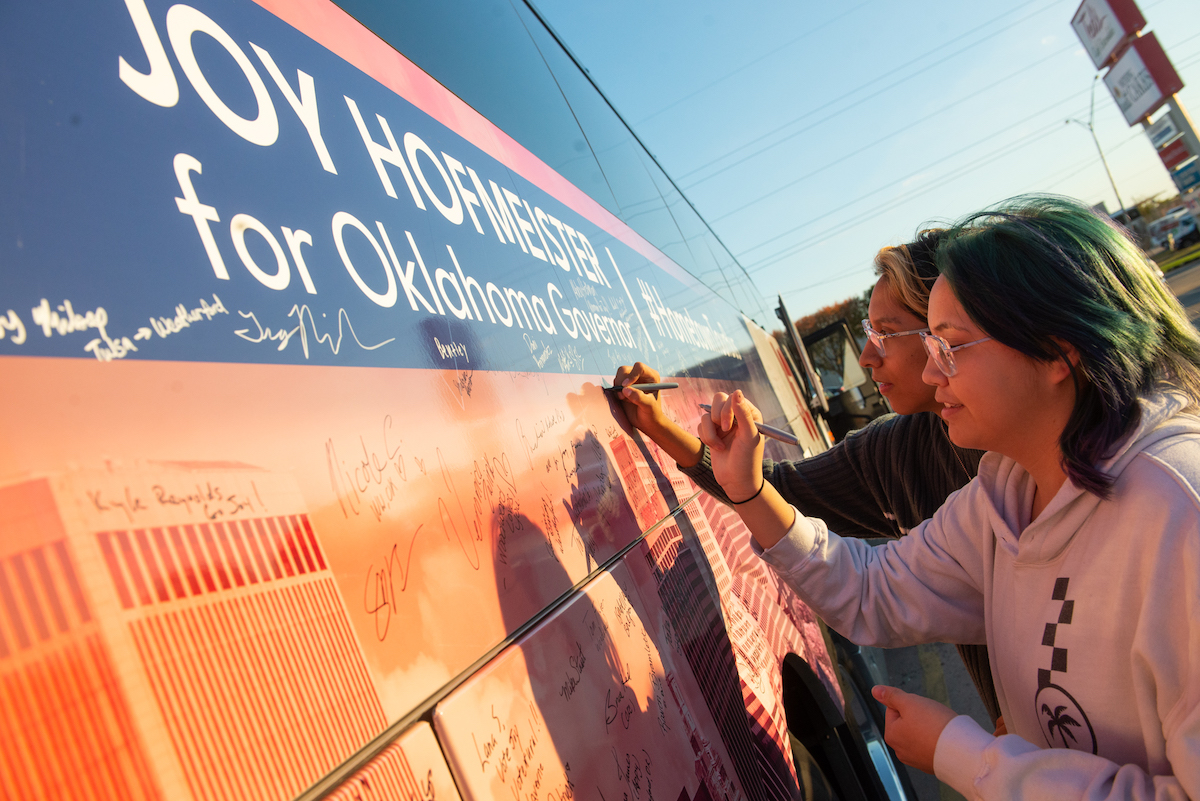 Hofmeister is crisscrossing the state in the last few days of the campaign on a charter bus signed by supporters, making stops from Grove to Guymon.