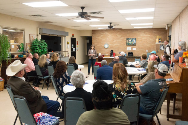 But Hofmeister’s campaign message to 40 residents, including several local teachers who gathered Tuesday night at the community building in the small Comanche County town, portrayed Stitt as a wolf in sheep’s clothing when it comes to public education funding. She said her opponent’s voucher plan would result in the closing of small schools.