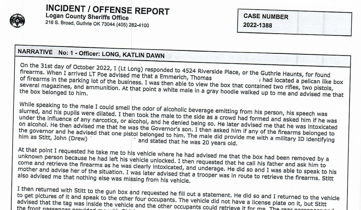 According to the sheriff’s office report (embedded below), Deputy Katlin Long responded to a call regarding “found firearms,” which were located in a box outside of a truck owned by Drew Stitt. An OSU student who joined the Oklahoma Army National Guard in 2020, Stitt approached Long and said the box of guns — containing two rifles, two pistols and ammunition — was his and that it may have been removed from his truck, which may have been left unlocked by accident. Long asked Drew Stitt if any of the firearms were his father’s, and he said one pistol belonged to the governor.