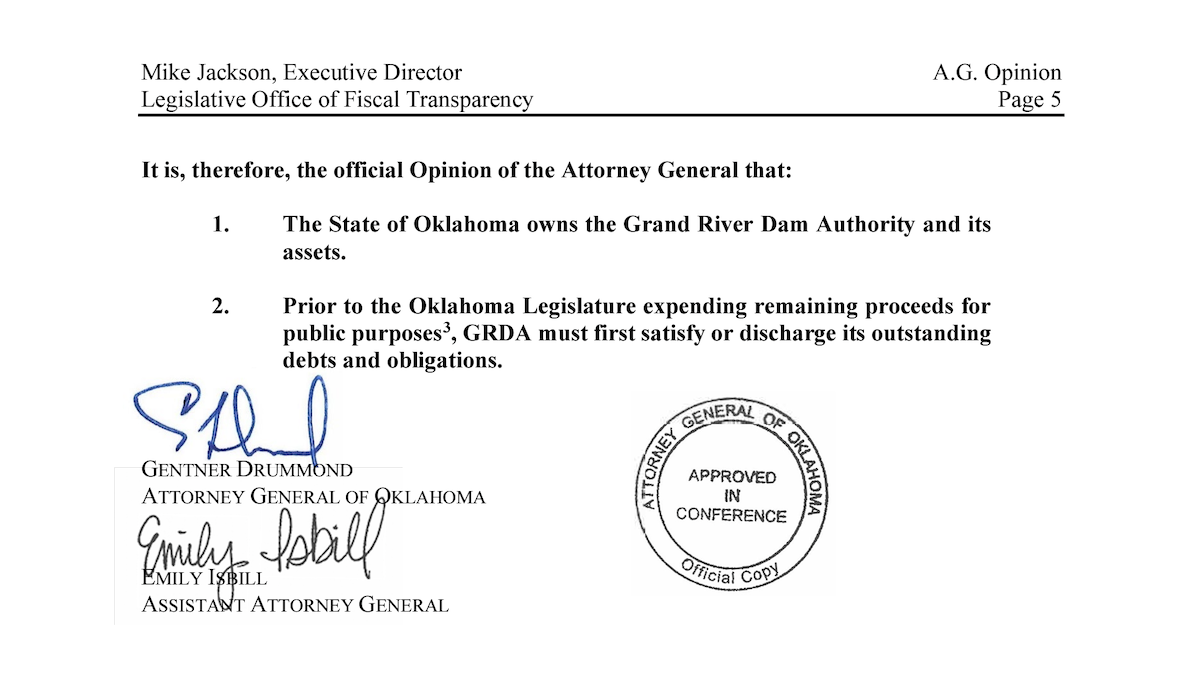 Jackson, the LOFT director, asked the Attorney General’s Office to clarify two points related to the GRDA: First, does the state of Oklahoma own GRDA’s assets? And second, if the Legislature were to direct GRDA to sell some or all of its assets, how would the proceeds be distributed?