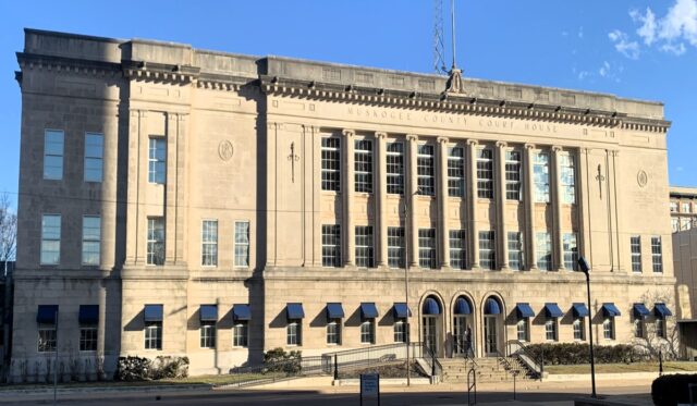 The sun sets on the Muskogee County Courthouse on Feb. 2, 2024. (Tristan Loveless)