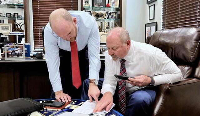From left: House Vice Chairman of Appropriations and Budget Trey Caldwell (R-Lawton) reviews Board of Equalization charts with House Appropriations and Budget Chairman Kevin Wallace (R-Wellston) on Thursday, Feb. 15, 2024. (Tres Savage)