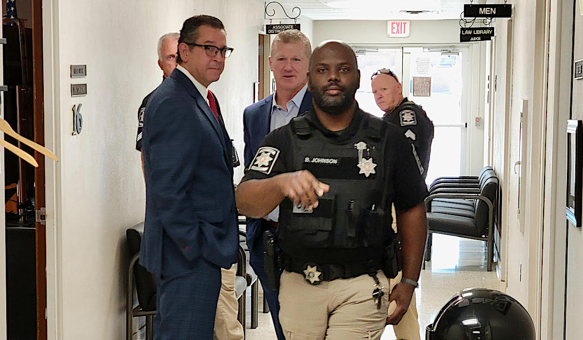 A Kingfisher County Sheriff's Office deputy declares a prohibition on photography while attorney Joe White, left, and former Kingfisher High School football coach Jeff Myers wait outside of a courtroom Thursday, June 27, 2024. (Michael McNutt)
